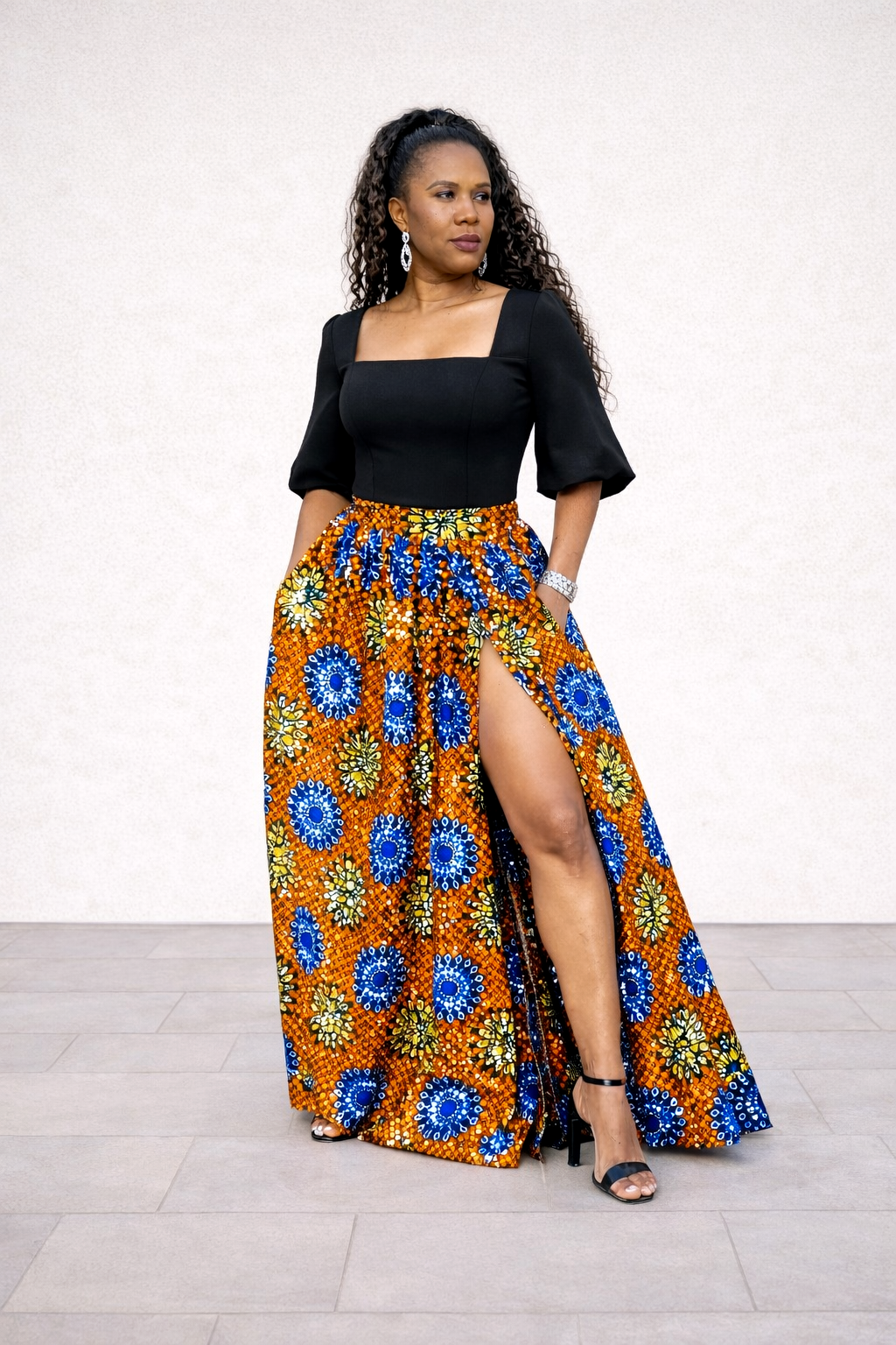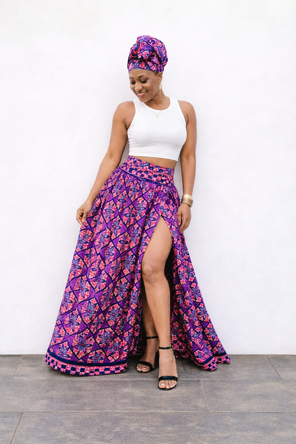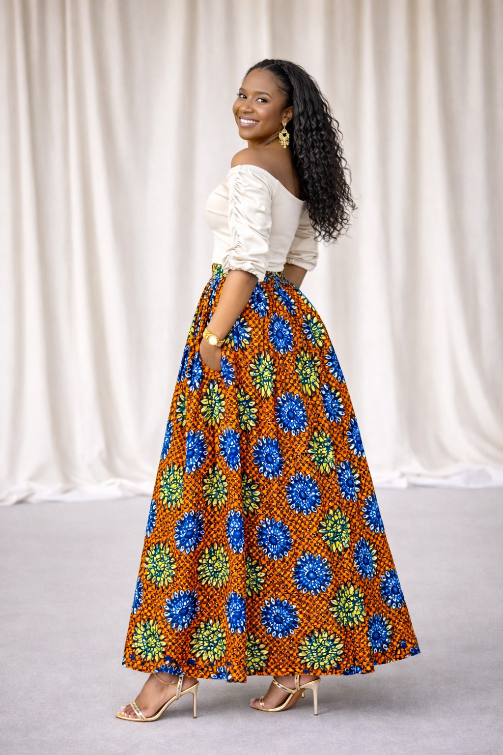 The Rubane Collection features bold African print maxi skirts designed to celebrate colour, heritage, and modern elegance. With a flattering high-waist silhouette and flowing structure, these skirts make a striking statement for any occasion.