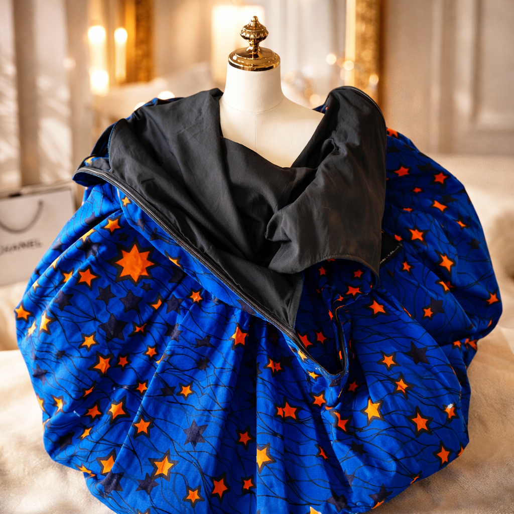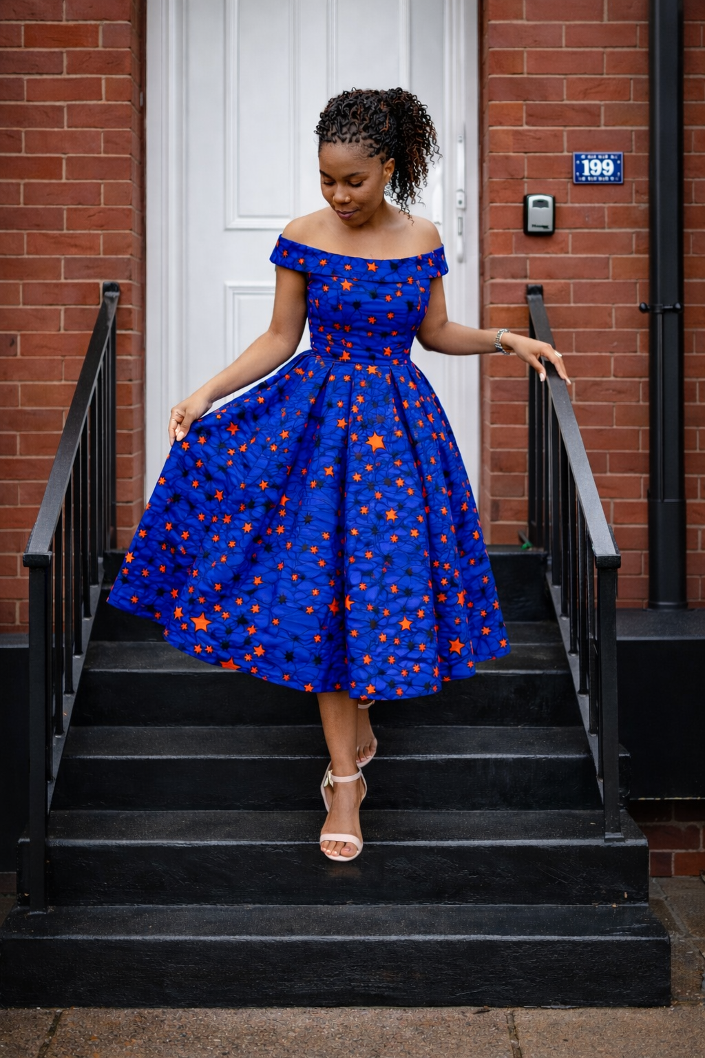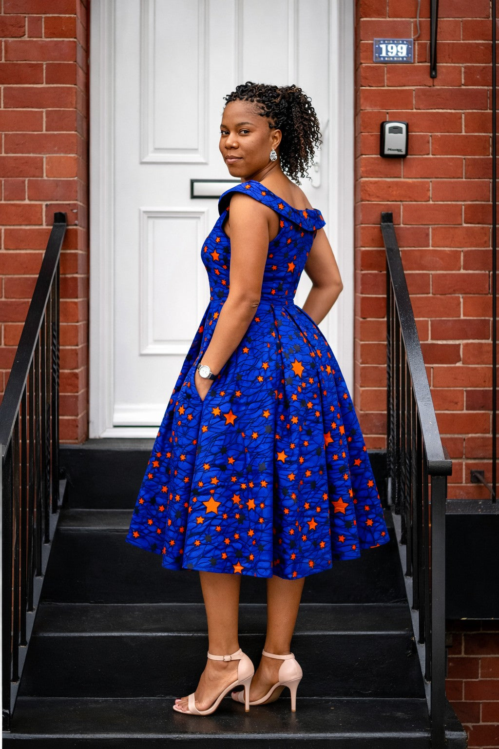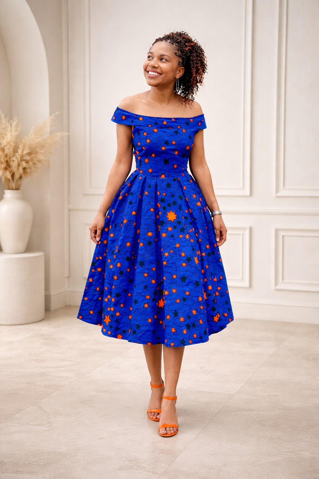 Make a statement in this vibrant royal blue African print midi dress featuring bold orange star detailing.